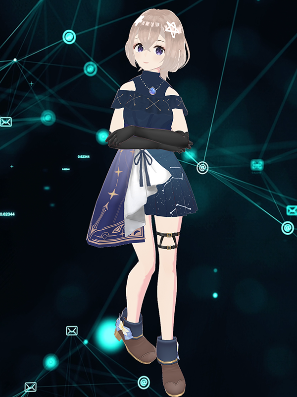在这次的比赛当中,我们系以标题「元宇宙虚拟网红创作设计大赛」其中「元宇宙」的概念创作出相关设计,以呼应此次大赛主题。举例来说,以「宇 宙」作为元素,设计黑蓝色百褶裙上的洒落星点及星座连线,象征在无垠的宇 宙中畅游科技世界的同时,也连结到大自然鬼斧神工的造物,将其一齐收进眼 底。而角色头上的白色星星发饰及半边裙也是相同概念,以体现出科技与宇宙 神秘无穷的特点。